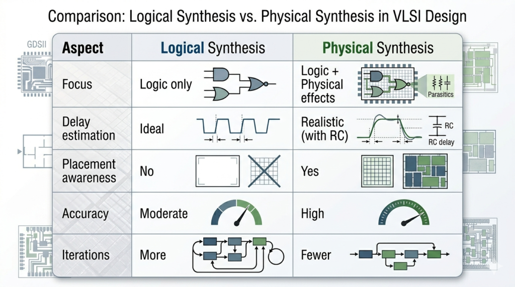 Physical Synthesis: Physical synthesis is an advanced synthesis technique in VLSI design where the optimization of a circuit is performed by considering not only logical functionality but also physical implementation effects such as placement, routing, interconnect delays, and parasitic elements. Unlike traditional synthesis, which assumes ideal conditions, physical synthesis uses early physical information to generate a gate-level netlist that is more accurate, realistic, and better aligned with the final silicon implementation, thereby improving timing, area, and power results.