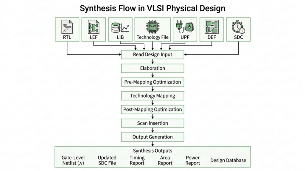 - Outputs Generation: The main outputs of synthesis include the gate-level netlist, updated constraint file, timing, area, and power reports, and a design database used for further optimization and Physical Design.